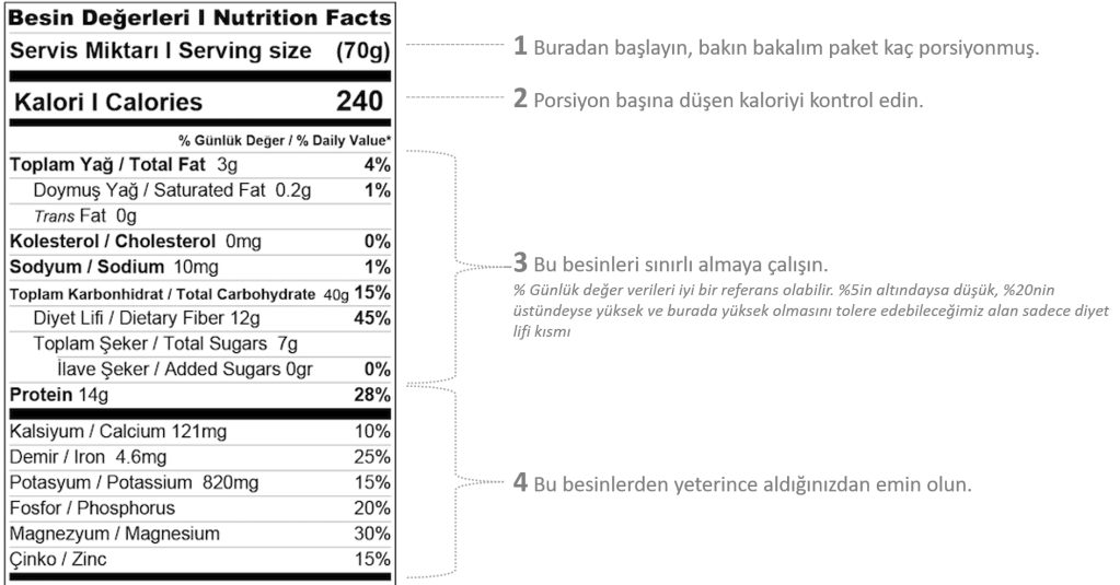 Pek çok insan besinlerle yeterince lif, A vitamini, C vitamini, kalsiyum ve demir edinmekte zorlanır. Bu yiyeceklerden doğru miktarlarda tüketmek pek çok hastalığı önlemekte yardımcıdır. Porsiyon başına 5 gr veya daha fazla diyet lifi içeren ürünler yüksek lifli diye sınıflandırılabilir. Ayrıca besinlerde yer alan vitamin ve mineraller genelde % ile gösterilir ve vücudunuzun günlük ihtiyacının ne kadarını karşıladığını görebilirsiniz. Hedefimiz elbette en az %100ünü karşılamaktır 🙂